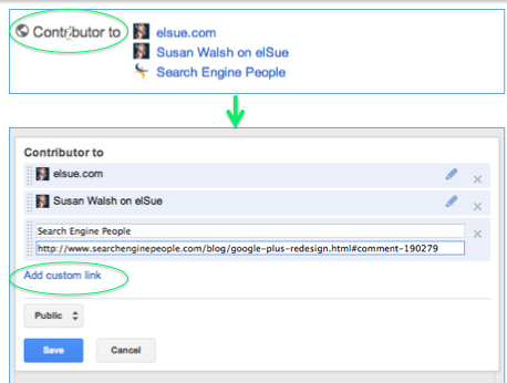 In your Google+ Profile at the bottom of the page you will see "Contributor to". This is a great feature. Add your website first and any other websites or blogs you write articles for. For example, elSue quest posts on Search Engine People. We did the following so that those posts will show up in the search results with the Author profile. All you need to do is:1. Click on "Contributor to" and the box will open up